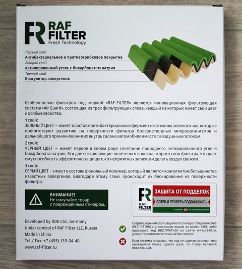 Особенностью фильтров под маркой RAF FILTER является инновационная фильтрующая система "Air Guard", состоящая из трех слоев особой фильтрующей бумаги. Каждый из слоев имеет свой цвет и особую пропитку.